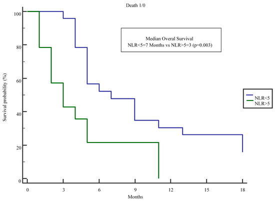 We then evaluated separately the subgroup of 81 patients with distant metastasis at diagnosis. At univariate analysis, the age of the patients (HR 1.03 95% CI 1.003–1.048 per increasing year; p = 0.028) and an NLR > 5 (HR 2.05 95% CI 1.21–3.46 p = 0007) were associated with worse OS, whereas access to chemotherapy (HR 0.59 95% CI 0.35–0.99 p = 0.049) was associated with a better OS. At multivariate analysis, only an NLR > 5 (HR 1.75 95% CI 1.02–3.03 p = 0.043) was significantly associated with prognosis (Table 3). Interestingly, when we further restricted the analysis to the 39 subjects with metastatic disease at diagnosis that actually received chemotherapy, those with an NLR > 5 showed a significantly lower OS (Figure 2) when compared to those with an NLR < 5 patients (median 3 vs. 7 months; p = 0.003).