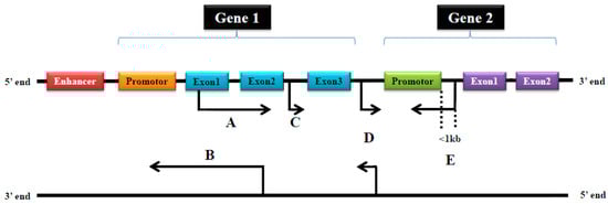 The classification of long noncoding RNAs (lncRNAs). (A) Sense lncRNAs are transcribed from the sense strand of protein-coding genes. They contain exons from protein-coding genes and therefore can share a part or the entire sequence of a protein-coding gene; (B) Antisense lncRNAs are transcribed from the antisense strand of protein-coding genes and they contain exons from protein-coding genes, and therefore can share a part or the entire sequence of a protein-coding gene; (C) Intronic lncRNAs are transcribed from an intron and therefore contain a sequence originating from the genomic interval between two exons; (D) Intergenic lncRNAs are transcribed from both strands and are an independent unit within the genomic interval between two genes; and (E) Bidirectional lncRNAs are transcribed from the promoter of a protein-coding gene in opposite direction of the protein-coding gene. Their sequence is located less than 1kb upstream from the promoter sequence.