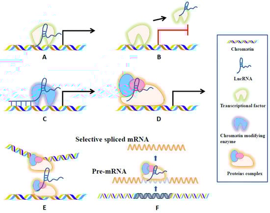 Schematic diagram of the six mechanisms of lncRNA functioning at transcriptional level. (A) LncRNAs can signal the activation of gene expression by integrating with one or more transcriptional factors; (B) LncRNAs can remove transcriptional factors from chromatin or they can compete for the miRNA target site, and, if successful, both mechanisms hault gene expression; (C) LncRNAs bind with chromatin, and this unit recruits chromatin modifying enzymes before guiding them to a target site for the initiation of gene expression; (D) LncRNAs can act as scaffolds to bring together multiple proteins and form ribonucleoprotein complexes, which subsequently induce gene expression; (E) LncRNAs regulate gene expression by acting on the spatial conformation of chromosomes; and (F) LncRNAs can hybridize to pre-mRNAs, block spliceosome recognition of splice sites, and regulate the alternative splicing of pre-mRNAs to produce different transcripts.