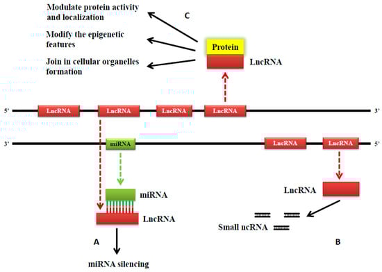 Schematic illustration of lncRNAs functioning at a post-transcriptional and epigenetic level. (A) LncRNA can silence miRNA by binding to it; (B) LncRNA can be precursors of sncRNA; and (C) When interacting with proteins, lncRNAs are capable of the following: modulating protein activity and localization; modifying epigenetic features including DNA methylation, histone methylation, acetylation or ubiquitination, and more; and contributing to the formation of cellular organelles.