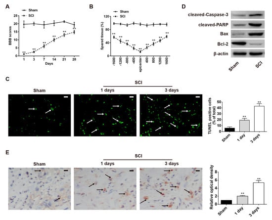 Establishment and verification of a laboratory rat SCI model. In the SCI group of rats, the skin was incised along the midline of the back, and the vertebral column was exposed. A laminectomy was performed at the T10 level. (A) Basso, Beattie, and Bresnahan (BBB) scores for hindlimb locomotion in each experimental group (n = 4 per group). (B) Quantification of lesion size within the injury site, and measurement of the distance between points 1600 μm rostral and caudal to the epicenter, seven days post-injury. Compared with the sham group, the SCI group had larger spared tissue areas at multiple distances from the lesion epicenter (n = 4/group). (C) TUNEL staining of spared tissues to analyze neuronal apoptosis at one and three days after SCI (n = 3/group/time point). Bright green dots indicate apoptosis positive cells. The white arrows point out TUNEL-positive cells. (D) Protein expression of cleaved caspase-3, cleaved PARP, Bcl-2, and Bax in the spinal cord segment at the contusion epicenter (n = 4/group). β-actin was used as the loading control and for band density normalization. (E) Expression of cleaved caspase-3 after SCI as detected by immunohistochemistry staining in spinal cord tissues collected from each group (n = 3/group/time point). The black arrows indicate cells stained positive with anti-cleaved caspase-3. Data are means ± SEM. ** p < 0.01 vs. the sham group. Scale bars in (C,E) 20 μm.