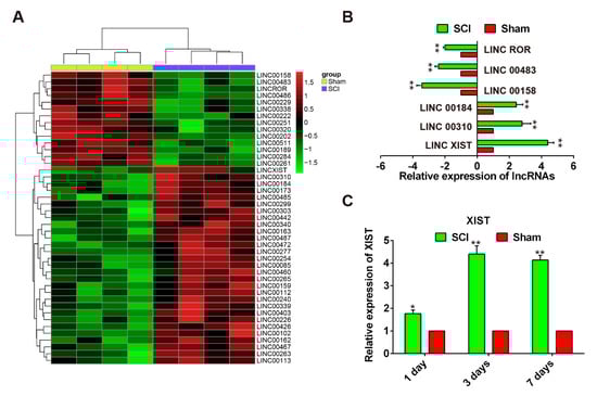 Upregulation of lncRNA-XIST in SCI model rats. (A) Heat map representation of differentially expressed lncRNAs in the sham and SCI group. Data were retrieved from the GEO dataset (accession number GSE5296). Expression values are represented in shades of red and green which indicate expression above and below the median expression value across all samples. (B) qRT-PCR analysis of six lncRNAs selected from the results of the microarray analysis, in spinal cord tissues collected from SCI model rats (n = 4/group). (C) Expression levels of lncRNA-XIST at one, three, and seven days after SCI, measured by qRT-PCR (n = 3/group/time point). Relative expression represents changes compared with the sham group, after SCI. Data are means ± SEM. * p < 0.05, ** p < 0.01 vs. the sham group.