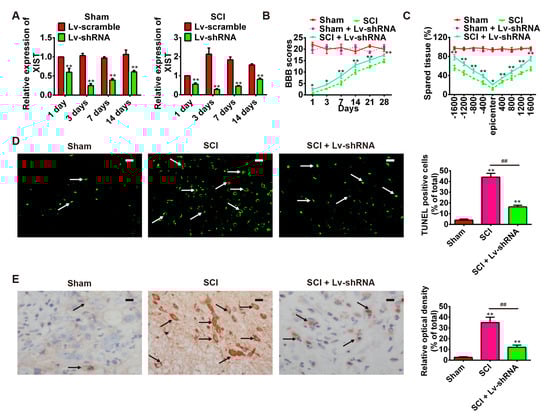 The observed increase in the expression of lncRNA-XIST in spinal cord tissues of rats in the SCI group compared with the control group, prompted us to investigate its biological role in the rat SCI model. Firstly, SCI rats were treated intrathecally with Lv-shRNA for three days. At scheduled time points, rats were euthanized with an overdose of 10% chloral hydrate (10 mg/kg body weight (bw)) and the expression of XIST in spinal cord tissues was measured by qRT-PCR. As shown in Figure 3A, expression of XIST was significantly reduced in the Lv-shRNA treated rats compared with that in Lv-Scramble-treated rats and reached a peak at three days both in sham and SCI groups. As indicated by the results of BBB scores, the locomotor activity of rats in the SCI + Lv-shRNA group was markedly improved compared with that of the SCI group from one day after contusion (Figure 3B). In addition, compared with the SCI group, Lv-shRNA treated rats had significantly larger spared tissue areas at multiple distances from the lesion epicenter, both in rostral and caudal directions (Figure 3C). Furthermore, we conducted TUNEL staining to confirm the functional role of lncRNA-XIST in cell apoptosis. As shown in Figure 3D, knockdown of lncRNA-XIST attenuated the apoptosis after SCI. In addition, we also tested the change in cleaved caspase-3 expression after knockdown of lncRNA-XIST using immunohistochemical staining. Compared with the rats in the SCI group, inhibition of lncRNA-XIST alleviated the expression of cleaved caspase-3 (Figure 3E). These results suggest that lncRNA-XIST knockdown has a protective effect and significantly improves SCI recovery; at least in part, by attenuating apoptosis.