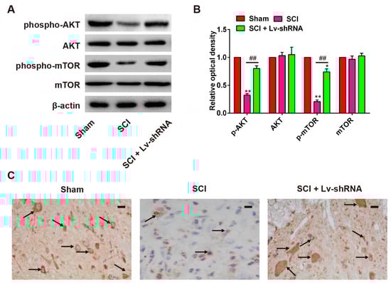 Effect of Lv-shRNA on activation of the PI3K/AKT/mTOR pathway in SCI rats. (A,B) Protein expressions of p-AKT, AKT, p-mTOR, and mTOR in rat spinal cord segments at the contusion epicenter. β-actin was used as the loading control and for band density normalization. Band optical densities were measured using Image-Pro Plus software. * p < 0.05, ** p < 0.01 vs. the sham group. ## p < 0.01 vs. the SCI group. n = 4/group. (C) Expression of p-AKT among the treatment groups as detected by immunohistochemistry staining. n = 4/group. The black arrows indicate cells stained positive with anti-p-AKT. Data are means ± SEM. Scale bars in (C) 20 μm.