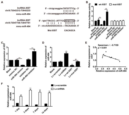 As mentioned above, lncRNAs have recently been reported to act as competitive endogenous RNAs for miRNAs [], consequently modulating the depression of miRNA targets. We, thus, hypothesized that lncRNA-XIST knockdown-mediated AKT activation may operate through a ceRNA mechanism. Firstly, bioinformatics tools were used to search for potential miRNAs regulated by lncRNA-XIST. According to the results of these analyses we focused on miR-494, a known oncogenic microRNA inhibiting cancer cell apoptosis. The binding sites between lncRNA-XIST and miR-494 are illustrated in Figure 5A. A luciferase reporter assay was used to test whether lncRNA-XIST targets miR-494. The results showed that overexpression of miR-494 significantly decreased the luciferase activity of wt-XIST-3′UTR, whereas knockdown of miR-494 increased luciferase activity. Likewise, cells co-transfected with miR-494 mimic, miR-494 inhibitor, and XIST-mut-3′UTR, showed no obvious change in their luciferase activity (Figure 5B). Furthermore, we explored whether lncRNA-XIST could modulate the expression of miR-494. As shown in Figure 5C, lncRNA-XIST expression decreased after overexpression of miR-494, whereas it increased after inhibition of miR-494. In addition, we found that miR-494 expression was increased after knockdown of lncRNA-XIST, whereas it was reduced after transfection with Lv-wt-XIST compared with Lv-mut-XIST (Figure 5D). These data indicate that there was reciprocal repression between XIST and miR-494. Next, we investigated whether the expression of lncRNA-XIST is inversely correlated with that of miR-494. We measured the level of lncRNA-XIST and miR-494 in 10 rats, and found that there was an inverse correlation between lncRNA-XIST levels and miR-494 levels (Spearman rank r = −0.7159, p < 0.001, Figure 5E). Furthermore, we also found that Lv-XIST significantly increased miR-494 level in spinal cord samples of SCI rats at different time points (Figure 5F). Thus, lncRNA-XIST could negatively regulate miR-494 expression, probably through their interaction in SCI rats.