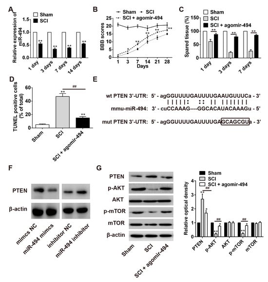 Effect of miR-494 on apoptosis in SCI rats by targeting PTEN. SCI rats were randomly divided into three groups: SCI group; SCI + agomir-494 group and sham group. (A) Expression of miR-494 at 1, 3, 7, and 14 days after SCI, as detected by qRT-PCR analysis. ** p < 0.01 vs. the sham group. n = 3/group/time point. (B) Effect of miR-494 overexpression by agomir-494 on hindlimb motor function (BBB scores). * p < 0.05, ** p < 0.01 vs. the SCI group. n = 3/group/time point. (C) Effect of miR-494 overexpression on tissue sparing at one, three, and seven days after SCI. ** p < 0.01 vs. the SCI group. n = 3/group/time point. (D) Effect of miR-494 overexpression on apoptosis after SCI, detected by TUNEL staining. ** p < 0.01 vs. the sham group. ## p < 0.01 vs. the SCI group. n = 4/group. (E) Predicted miR-494 binding sites in the 3′-UTR region of PTEN (PTEN-3′-UTR-WT) and the corresponding mutant sequence (PTEN-3′UTR-MUT). (F) Protein expression of PTEN after treatment with miR-494 mimic or miR-494 inhibitor in HEK293 cells. (G) Protein expressions of PTEN, p-AKT, AKT, p-mTOR, and mTOR in spinal cord segments after agomir-494 treatment. Band optical densities were measured using Image-Pro Plus software. * p < 0.05, ** p < 0.01 vs. the sham group. ## p < 0.01 vs. the SCI group. n = 4/group. Data are means ± SEM.