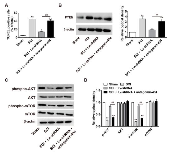 Following on from the above findings, we sought to further explore whether the miR-494/PTEN/AKT/mTOR axis was involved in the anti-apoptotic effects of lncRNA-XIST knockdown in the SCI rat model. First, Lv-shRNA and antagomir-494 were together injected into the wound areas of the SCI model rat, and the percentage of apoptosis in the tissues was compared with that in the SCI + Lv-shRNA group, the SCI group and the sham (control) group. TUNEL staining of apoptotic cells revealed that apoptosis was attenuated in the SCI + Lv-shRNA group compared with the SCI group. It was also found that antagomir-494 could block the inhibitory effects of Lv-shRNA on apoptosis so that, when administered together, apoptosis was significantly higher than in the SCI + Lv-shRNA group (Figure 7A) (p < 0.01). Western blot analysis showed that PTEN expression was decreased in the SCI + Lv-shRNA group compared with the SCI group, and that this inhibitory effect was removed by the co-administration of antagomir-494 (Figure 7B) (p < 0.05). Interestingly, p-AKT and p-mTOR expressions were restored in the SCI + Lv-shRNA group compared with the SCI group. Meanwhile, it was also observed that antagomir-494 could inhibit the enhancing effects of Lv-shRNA on PI3K/AKT activation in SCI rats, when antagomir-494 and Lv-shRNA were administered together (Figure 7C,D). These results suggest that lncRNA-XIST knockdown inhibited the expression of PTEN by competitively binding with miR-494, resulting in promotion of the activation of the AKT/mTOR pathway, thus alleviating apoptosis after SCI.
