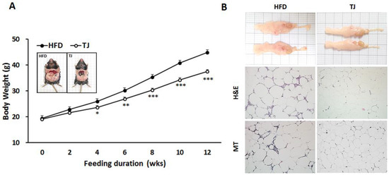 2.1. Taeeumjowuitang (TJ) Lowered Both Body and White Adipose Tissue (WAT) Mass, and Improved Fat Tissue Morphology in Diet-Induced Obese (DIO) Mice