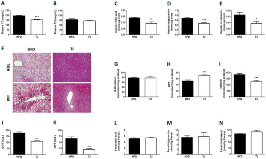 2.2. TJ Improved Lipid Profiles in Plasma and Liver, and Hepatic Tissue Morphology, While Altering Hepatic Lipid Regulating Enzyme Activities in DIO Mice