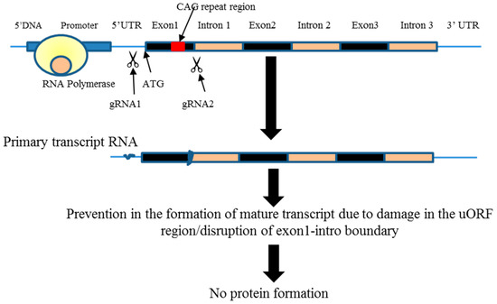 It was previously reported that 5′ untranslated region (UTR) of the huntingtin gene plays a critical role in regulating the synthesis of the HTT [21]. Particularly, the presence of upstream open reading frame (uORF) within 5′ UTR can affect the translation of the downstream ORF [22,23,24]. Based on this fact, we have hypothesized that the designed CRISPR-Cas9 plasmid could disrupt the uORF present within the 5′ UTR of the mRNA, thus reducing the translation of the mutant huntingtin gene product in the MSCs derived from YAC128 mouse model. It is known that the disruption of the uORF of the gene would activate stop codons as a protective mechanism in order to terminate the transcription of a mutant gene (Figure 1). Given this, we have designed another CRISPR-Cas9 plasmid with the gRNA targeting the exon1-intron boundary and observed the effect of its disruption on the translation of the HTT protein.
