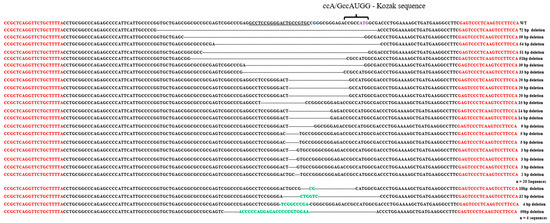 - Kozak, M. Point mutations define a sequence flanking the AUG initiator codon that modulates translation by eukaryotic ribosomes. Cell 1986, 44, 283–292. [Google Scholar] [CrossRef]