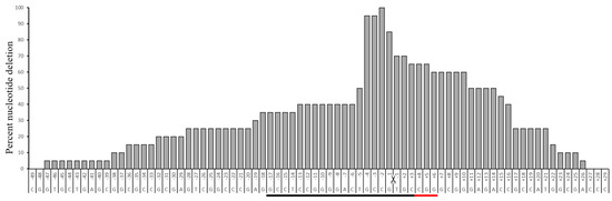 Percent nucleotide deletion after application of CRISPR-Cas9-gRNA1 at the uORF site. This graph highlights the pattern of nucleotide deletion on either side of the double-strand break (DSB) point. The deletion of the neucleotides were observed on both sides of the DSB region. Towards the upstream of DSB, nucleotides are labeled as +1, +2, and so on. Nucleotides towards the downstream of the DSB are labeled as −1, −2, and so on. Underlined in black is the gRNA1 sequence, and in red is the PAM sequence. As can be seen, the greatest percentage of nucleotide deletions are those closest to the DSB-point.