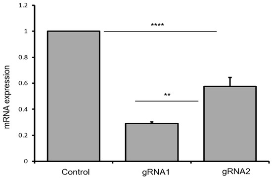Quantitative reverse transcriptase-PCR (qRT-PCR) was used to examine the level of mRNA expression in the puromycin-selected cell cultures. Statistical analysis was performed to compare differences in gene expression between control MSCs (carrying transgene) and each of the individual treatment groups (i.e., Lenti-CRISPRv2-gRNA1 and Lenti-CRISPRv2-gRNA2), as well as differences between the three treatment groups (Figure 5). Statistical analyses revealed that targeting both the untranslated region and exon1-intron region of the gene resulted in overall significant difference (F(2, 6) = 227.88, p < 0.000). Levels of mRNA were compared between the control MSCs and the groups receiving CRISPR-gRNA1-mediated editing, showing a significant decrease in the expression of mHTT (t(4) = 93.89, p < 0.0000). Similarly, there was a significant decrease in mRNA levels between control and gRNA2 (t(4) = 10.54, p < 0.000). Interestingly, a significant difference between expression of mRNA levels from mHTT gene in CRISPR-gRNA1 and CRISPR-gRNA2 treatment (t(4) = 2.78, p < 0.002), was also observed, suggesting that targeting untranslated regions in the gene would be a better choice when compared to targeting exon1-intron junctions to achieve gene silencing.