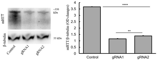 Reduction of HTT in treated MSCs was observed in Western blot (Figure 6), supporting the finding observed in qRT-PCR analysis. Statistical analyses revealed that targeting both the untranslated region and exon1-intron region of the gene resulted in an overall significant difference (F(2, 6) = 9450, p < 0.000). Post hoc analysis using Tukey HSD test indicated that there was a significance difference between the gRNA1 and gRNA2 treatments (p < 0.05), supporting the finding from the qRT-PCR data.