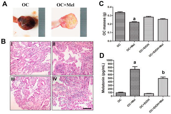 Development and treatment of OC (Ovarian Cancer). (A) Anatomopathological specimens of the untreated and melatonin-treated OCs; (B) micrographs of the OCs showing serous papillary architecture in OC (I), OC + Mel (melatonin) (II), OC + EtOH (ethanol) (III), and OC + EtOH + Mel (IV) groups. Bar = 20 µm; (C) OC mass was measured at the end of treatments, a p < 0.05 vs. OC; (D) plasma melatonin levels (pg/mL) after the last treatment dose, a,b p < 0.05 vs. OC and OC + EtOH, respectively. n = 15 animals/group.