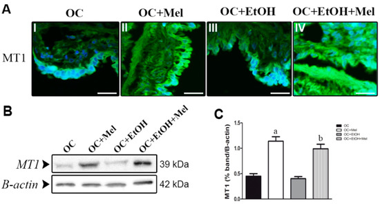Immunofluorescence localization and Western blot analysis of MT1 (type 1 melatonin receptor) in serous papillary OC. (A) Merged images of the immunofluorescence of MT1 and DAPI (4′,6-Diamidino-2-Phenylindole ) nuclear staining in OC (I), OC + Mel (II), OC + EtOH (III) and OC + EtOH + Mel (IV) groups; (Alexa fluor® 488, Bar = 20 µm, negative controls were used); (B) Representative MT1 profile of extracts (70 µg proteins) pooled from seven samples/group (left panel); (C) extracts obtained from individual animals were used for densitometric analysis of the MT1 levels following normalization to the β-actin. Data are expressed as the mean ± SD (n = 7). a p < 0.05 vs. OC; b p < 0.05 vs. OC + EtOH.