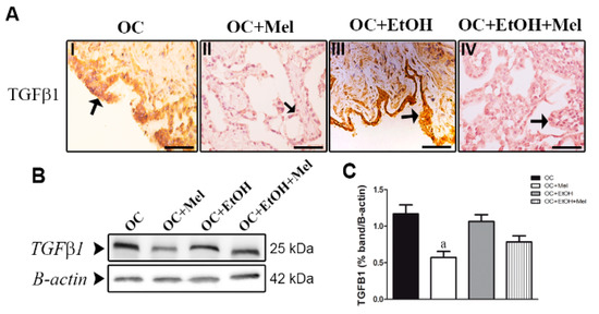TGFβ1, an important factor associated with tumor migration and invasiveness, was only downregulated following melatonin therapy alone. In the OC + Mel group, the epithelial cells of the papillae and stromal cells showed a weak signal for TGFβ1 (Table 1, Figure 4A(I,II)), different from the OC + EtOH + Mel group, which showed a moderate signal (Table 1, Figure 4A(III,IV)). Furthermore, the expression of TGFβ1 was significantly reduced after melatonin therapy (1.16-fold reduced vs. OC; Figure 4B,C).
