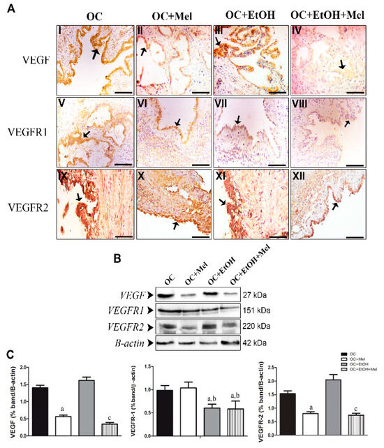 Immunohistochemical localization and western blot analysis of VEGF, VEGFR1, and VEGFR2 in serous papillary OC. (A) The immunoreaction of VEGF was moderate to high in the OC (I) and OC + EtOH (III) groups, while the groups OC + Mel (II) and OC + EtOH + Mel (IV) showed a weak reaction after melatonin treatment (black arrow). The immunoreactions of VEGFR1 varied from weak to moderate in the surface epithelium of the OC (V) and OC + Mel (VI) animals, and only a weak reaction was notable in the OC + EtOH (VII) and OC + EtOH + Mel (VIII) groups (black arrow). A strong reaction to VEGFR2 was present in the papillae epithelium of the OC (IX) and OC + EtOH (XI) groups, and melatonin treatment led to weak or even absence of VEGFR2 immunostaining in the OC + Mel (X) and OC + EtOH + Mel (XII) animals (black arrows). Bar = 20 µm. Negative controls were used. (B) Representative profile of the VEGF, VEGFR1, and VEGFR2 levels obtained from protein extracts (70 µg) pooled from seven samples/group (upper panel). (C) Extracts obtained from individual animals were used for densitometric analysis of the proteins following normalization to house-keeping protein (β-actin). Data are expressed as the mean ± SD (n = 7). a p < 0.05 vs. OC; b p < 0.05 vs. OC + Mel; c p < 0.05 vs. OC + EtOH.