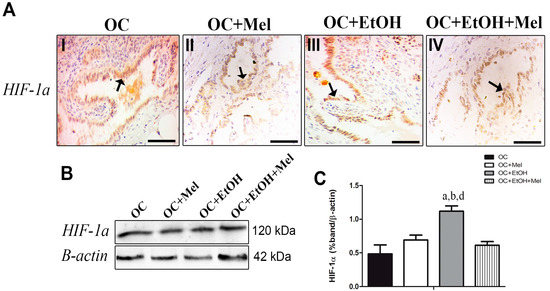 Although melatonin therapy seemed to slightly reduce HIF-1α immunostaining in the epithelial cells of OC + Mel and OC + EtOH + Mel groups (Table 1, Figure 6A(I–IV)), it was only significantly reduced in the OC + EtOH + Mel group (0.74-fold reduced vs. OC + EtOH; Figure 6B,C). EtOH consumption resulted in higher levels of HIF-1α compared to other groups and melatonin therapy efficiently restored these levels to near those in the OC rats.