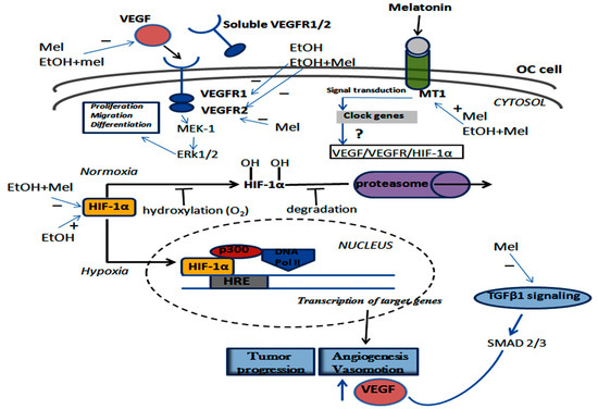 Schematic representation of the VEGF/VEGFR/HIF-1α signaling pathway and the effects of melatonin treatment leading to the activation or repression of downstream molecules in OC cell. This activation seems to be mediated by MT1 and possibly via clock genes. Intracellular signaling results in the phosphorylation cascade and, under normoxia, HIF-1α is degraded via the proteasome pathway. Otherwise, under hypoxia condition, the stabilized HIF-1α is translocated to the nucleus to promote the transactivation of target genes related to tumor progression/differentiation, angiogenesis, and vasomotion. VEGF, VEGFR2, HIF-1α, and TGFβ1 are downregulated by Mel and/or the association EtOH+Mel. Melatonin therapy also positively regulated MT1 expression in OC.