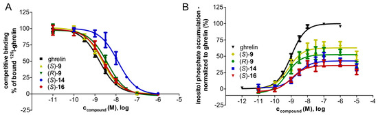 Binding affinity (A) and agonistic properties (B) of the non-peptidic candidate compounds (S)-9, (R)-9, (S)-14, and (S)-16. Compounds were tested at membranes of HEK293 cells stably transfected with the hGhrR for competitive binding properties against [125I]ghrelin (A); Data are means ± SEM (n ≥ 4). Agonistic properties of the compounds were analyzed by inositol phosphate accumulation in COS7 cells stably transfected with the hGhrR (B). Data were normalized to ghrelin (100% = maximal efficacy, 0% = constitutive receptor activity) and given in percent as means ± SEM of ≥3 independent experiments performed in duplicates.