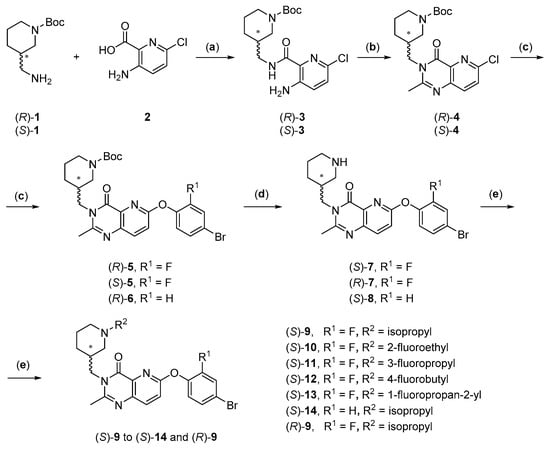 The lead compound (S)-9 was synthesized as previously described with some modifications [44]. The synthesis started from the commercially available (R)-tert-butyl 3-(aminomethyl)piperidine-1-carboxylate ((R)-1, Scheme 1), which was coupled with the carboxylic acid 2 in presence of the coupling reagent BOP (benzotriazole-1-yl-oxy-tris-(dimethylamino)-phosphonium hexafluorophosphate) to give amide (R)-3 that was further cyclized with 1,1,1-triethoxy ethane in thermal reaction conditions to give the 6-methylpirimid-2-one intermediate (R)-4. Cs2CO3 promoted diaryl ether formation followed by trifluoroacetic acid (TFA)-mediated tert-butyloxycarbonyl (Boc) group removal delivered the key building block (S)-7 in ~55% yield over five steps. N-alkylation with 2-iodopropane gave (S)-9 in 89% yield. From a bulk of (S)-7 a small series of fluorinated derivatives ((S)-10, (S)-11, (S)-12, and (S)-13; see Scheme 1) was synthesized by alkylating the free amino group at the piperidine subunit in basic reaction conditions. In parallel, the hitherto unreported (R)-9 enantiomer was obtained by using the same synthesis sequence (Scheme 1, reactions (a)–(e)) starting from (S)-tert-butyl 3-(aminomethyl)piperidine-1-carboxylate ((S)-1). Additionally, to avoid possible radiolysis during the radiofluorination process, compound (S)-14 lacking the fluorine atom at the phenyl subunit was synthesized starting from (S)-4 in >80% yield over three steps (Scheme 1, reactions (c)–(e)).