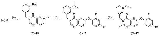 Next, we focused on the possibility of introducing a fluorine atom at the pyrimidine 2-position. To achieve this, compound (R)-3 was cyclized to the corresponding pyrimidine-3(4H)-one by trimethyl orthoformate under thermal reaction conditions ((R)-15, Scheme 2). Diaryl ether formation, Boc-group removal, and piperidine N-alkylation with 2-iodopropane were performed as described above to give (S)-16 depicted in Scheme 2. Straight forward fluorination at the aminal position of (S)-16 by tetrabutylammonium fluoride (TBAF) in N,N-dimethylformamide (DMF) at elevated temperature led to (S)-17 in moderate yield (23%, see Scheme 2).