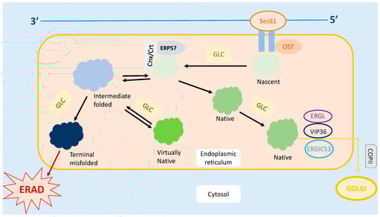ER is also responsible for the quality control of the proteins produced. Several complex mechanisms tightly regulate the protein trafficking in the ER [8], as shown in Figure 1. Under these quality control mechanisms, only correctly folded proteins can be transported out of the ER, while the misfolded proteins are either refolded or undergo ER-Associated Degradation (ERAD) [8,9,10]. Therefore, it is crucial for the ER to differentiate the misfolded proteins from those which are correctly folded and nascent. Nascent proteins display an addition of N-acetylglucosamine-mannose-glucose [11]. Only correctly folded proteins undergo glucosidase cleavage and are translocated to the Golgi complex [8,10]. Meanwhile, misfolded proteins are recognized by their abnormal hydrophobic bonds via the chaperones that reside inside the ER [8]. These misfolded proteins are prevented from exiting the ER by Calnexin/Calreticulin (Cnx/Crt) [8].