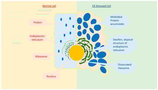 ERS not only affects cellular homeostasis, but also cellular morphology. As shown in Figure 2, cells that undergo ERS have an altered ER morphology, such as luminal swelling and atypical structures [19]. ERS has an enormous impact on overall cellular processes. It is known to reduce the functional transcription and translation processes, as well as the intracellular and extracellular signaling pathways [6]. As a result, it can lead to various diseases [6].