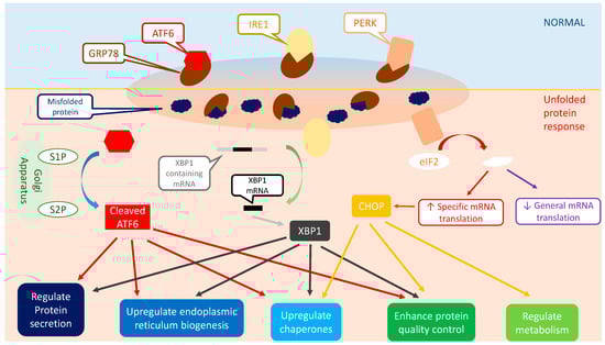 ER stress (ERS) arises after the accumulation of misfolded proteins in the ER. ERS can reduce the production of functional proteins and even lead to apoptosis. To relieve the cell from ERS, an evolutionarily conserved mechanism called the unfolded protein response (UPR) is activated [2]. UPR consists of numerous complex, multifactorial, and parallel pathways that act to reduce and remove misfolded proteins. UPR triggers multiple mechanisms to decrease protein synthesis, enhance the protein folding mechanism, and remove the terminal misfolded protein [2,3].
