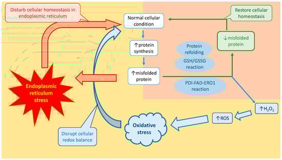 Besides the GSH/GSSG reaction, PDI is also responsible for causing both ERS and OS. Similar to the GSH/GSSG reaction, PDI is a multifunctional oxidoreductase chaperone protein that is involved in the oxidative protein folding process [97]. It is used to catalyze the formation of disulfide bonds [97]. During the oxidative protein folding process, PDI receives two electrons from the polypeptide chain substrate via cysteine residues, and is therefore able to oxidize the polypeptide chain substrate and reduce the PDI protein active sites [97]. However, it has been proposed that other ER resident enzymes also assist PDI in the oxidative folding process. For instance, ER Oxidoreductin 1 (ERO1) was found to play an important role in assisting PDI in the oxidative folding process. After PDI receives the electrons from the polypeptide substrate chain, ERO1 recruits Flavin Adenine Dinucleotide (FAD) to conduct a redox reaction on PDI [97]. The redox reaction transfers the electrons to the oxygen molecules, producing hydrogen peroxide, a type of ROS, and causes OS [97]. In a study by Tu et al., ERO1 null yeast and mice were found to have reduced ROS levels, compared to the control groups [94]. It was reported that about 25% of all the ROS in the in vitro yeast model were produced from an ERO1 redox reaction during the disulfide bond formation [94]. This process enhances the production of ROS and alters the redox balance in the ER. Moreover, the redox imbalance disturbs the protein folding pathway, leads to the upregulation and accumulation of misfolded proteins, and thus induces ERS. Interestingly, several other ER-resident enzymes play a role similar to ERO1, including quiescin sulfhydryl oxidase, peroxiredoxin, and vitamin K epoxide reductase [98]. Figure 4 shows a summary of the connection between ERS and OS.