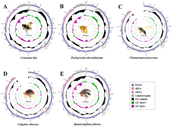 Mitochondrial genomes of five lauxaniid flies sequenced in this study. (A) Cestrotus liui; (B) Pachycerina decemlineata; (C) Chamaemyia juncorum; (D) Celyphus obtectus; (E) Spanicelyphus pilosus. Circular maps were drawn with CGView [55]. Arrows indicated the orientation of gene transcription. The tRNAs are denoted by the color blocks and are labelled according to the IUPAC-IUB single-letter amino acid codes (L1: CUN; L2: UUR; S1: AGN; S2: UCN). The guanine-cytosine (GC) content was plotted using a black sliding window, as the deviation from the average GC content of the entire sequence. GC-skew was plotted as the deviation from the average GC-skew of the entire sequence. The inner cycle indicated the location of genes in the mt genome.