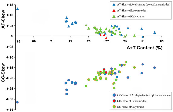 AT% vs. AT-Skew and GC% vs. AT-Skew in Cyclorrhapha mt genomes. Measured in bp percentage (X-axis) and level of nucleotide skew (Y-axis). Values are calculated on full length mt genomes. Blue, Acalyptratae (except Lauxanioidea); Red, Lauxanioidea; Green, Calyptratae; triangle, AT% vs. AT-Skew; circle, GC% vs. AT-Skew.
