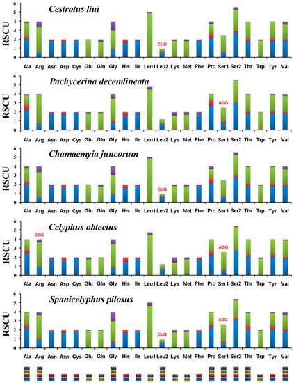 Relative synonymous codon usage (RSCU) in the five lauxanioid mt genomes. Codon families are provided on the X-axis. Stop codon is not given. Red codon, codon not present in the chain/genome.