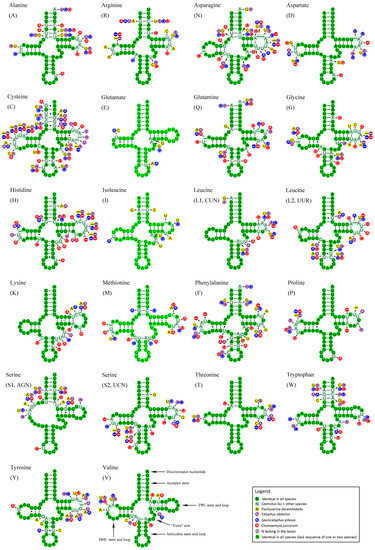 - Rawlings, T.A.; Collins, T.M.; Bieler, R. Changing identities: tRNA duplication and remolding within animal mitochondrial genomes. Proc. Natl. Acad. Sci. USA 2003, 100, 15700–15705. [Google Scholar] [CrossRef]