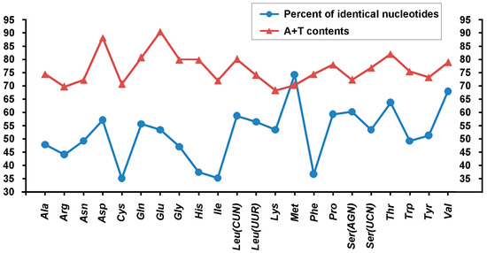 Nucleotides conservation and A + T contents of tRNAs in cyclorrhaphan mt genomes. Blue circle, percent of identical nucleotides; Red triangle, A + T contents.