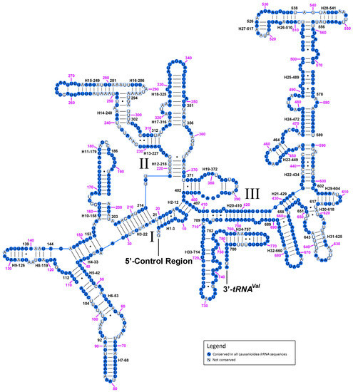 Secondary structures of both subunits of rRNA of Cestrotus liui mt genome were inferred using published rRNA secondary structures of N. mamevi [30] in Figure 8 and Figure 9, with nucleotides conserved among the five lauxanioid mt genomes shown in solid circles. The lrRNA had 43 helices in five structural domains (I–II, IV–VI, domain III is absent as in other insects). The multiple alignments of lauxanioid lrRNAs spanned 1350 positions and contained 974 conserved (with the same nucleotide in all five lauxanioid lrRNAs) (72.1%) and 376 variable positions (with at least one different nucleotide amongst five lauxanioid lrRNAs) (27.9%), respectively (Figure 8). The srRNA included three domains and 34 helices. The multiple alignment of lauxanioid srRNAs extended over 795 positions and contained 582 conserved (73.2%) and 213 variable sites (26.8%) (Figure 9). Secondary structures of all mt rRNAs from the Cyclorrhapha were inferred in Figures S4 and S5. Nucleotide conservation of the two rRNA genes was unevenly distributed among structural domains. Domains IV and V in lrRNA were more conserved than other domains, while the most conserved domain in srRNA was domain III (Figures S4 and S5).
