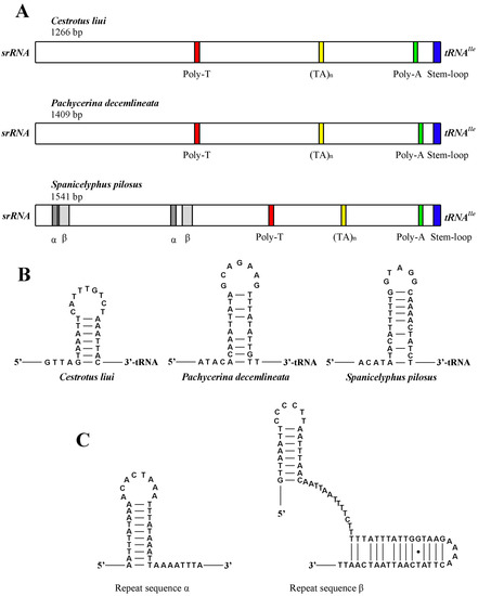 Predicted structure elements in the control region of Cestrotus liui, Pachycerina decemlineata, Spanicelyphus pilosus. (A) Control region structure of three species; (B) secondary structures of stem-loop structure at 3′-end of the control region; (C) secondary structures of repeat sequences of Spanicelyphus pilosus. Inferred Watson–Crick bonds are illustrated by lines, GU bonds by dots.