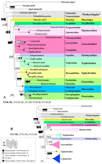 The phylogenetic trees inferred from both Bayesian and Maximum Likelihood (ML) analyses yield a consensus topology across the four datasets with the majority of nodes supported by all datasets and analyses (Figure 11A); all eight trees are shown in Table S7; discordant nodes will be discussed below. The monophyly of the Opomyzoidea, Tephritoidea, Ephydroidea and Calyptratae were consistently supported (posterior probability = 1.00 all datasets, ML bootstrap = 100 all datasets), as was the monophyly of the Brachycera (posterior probability = 1.00, ML bootstrap = 99/99/98/100 for the P123/P123R/P12/P12R datasets) and Cyclorrhapha (posterior probability = 0.99/1.00/0.99/1.00, ML bootstrap = 83/100/84/100). “Aschiza” was not monophyletic, and the Phoridae was the sister group of the remaining Cyclorrhapha (posterior probability = 1.00, ML bootstrap = 100/100/100/99), which is widely accepted by previous studies [48,50,70,71,72,73]. As has previously been found by Wiegmann et al. [51], (Ephydroidea + Calyptratae) formed a monophyletic group (posterior probability = 1.00, ML bootstrap = 83/93/78/96).