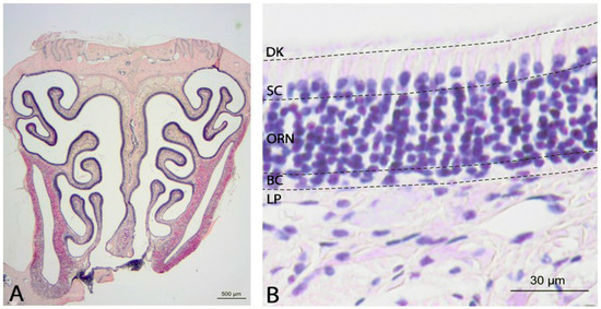 Structural overview of the OE (H&E): (A) frontal section of the nasal cavity of a NPC1+/+ mouse (56 days); and (B) structural composition of the olfactory mucosa including the lamina propria (LP) and the olfactory epithelium with basal cells (BC), olfactory receptor neurons (ORN), supporting cells (SC) and cilia/dendritic knobs (DK).