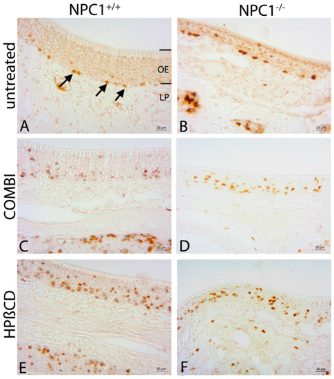 Immunohistochemical reaction of BrdU(+) proliferating cells. (A) Proliferating cells of untreated NPC1+/+ mice are mainly located in the basal third of the OE (arrows); (B) In untreated NPC1−/−, BrdU(+) cells are distributed in clusters in the basal compartment as well as in the region of ORNs and supporting cells. The thickness of the epithelium is considerably reduced. COMBI-treated NPC1−/− (D); and HPΒCD-treated NPC1−/− (F) demonstrate an increased proliferation activity with less clustered but more regularly distributed cells. COMBI-NPC1+/+ (C); and HPΒCD-NPC1+/+ (E) exhibit a higher proliferation activity than untreated NPC1+/+ (A) as well as untreated and treated NPC1−/− (B,D,F) mice in all epithelial layers.