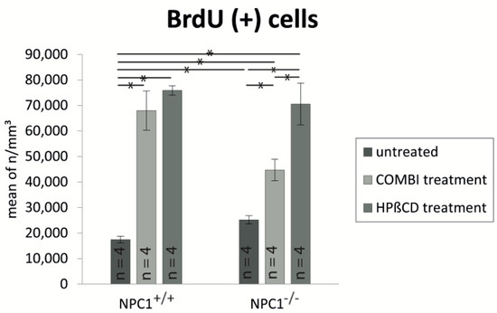 Proliferation analysis of untreated, COMBI- and HPΒCD-treated NPC1+/+ and NPC1−/− mice show a remarkable increase of newly formed cells in all groups compared to untreated NPC1+/+. Both treatments result in a particularly clear enhancement of proliferation in NPC1−/− but also in NPC1+/+. The monotherapy reveals a higher proliferation rate than the COMBI-treatment in NPC1+/+ and NPC1−/− mice. All data represent the mean ± SEM. p < 0.05 was considered significant (* p < 0.05). For p-values see text.