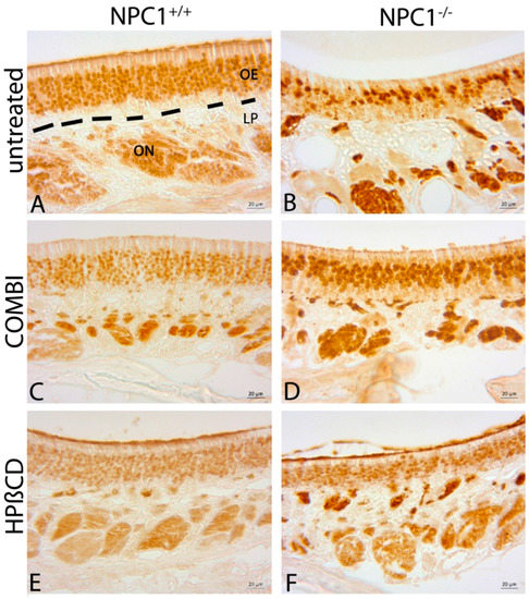 Our results confirm the beneficial effect on normalized motor behavior and prevention of weight loss. With regard to cell and tissue dynamics, our data revealed that the number of proliferating cells significantly increases. Furthermore, after seven weeks of treatment, the number of mature ORNs did not diminish in the same degree, and apoptotic processes were distinctly reduced to 55% when compared to untreated NPC1−/−. Accordingly, we observed a reduced immunoreactivity of cathD compared with untreated NPC1−/−, however, accompanied with an immunoreactivity still more extensive than in NPC1+/+ mice indicating ongoing neurodegenerative processes.