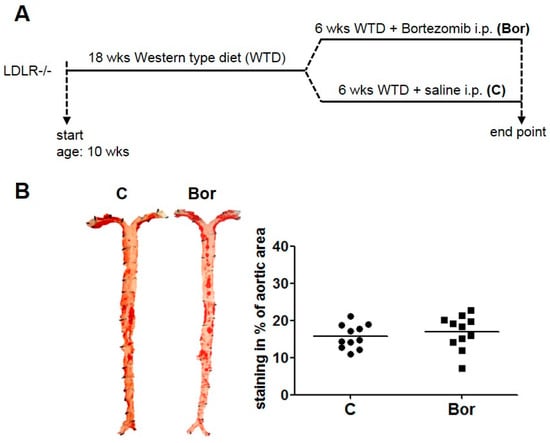 Recent studies investigating proteasome inhibition in different animal models of atherosclerosis have yielded conflicting results, ranging from pro-atherogenic effects [,] to anti-atherogenic effects [,]. Comparability of these studies is limited as they use different animal models, proteasome inhibitors, and doses, as well as target different stages of atherosclerosis. In addition to the above-mentioned atherosclerosis stage dependency, the effects of proteasome inhibitors may be particularly dose-dependent. We have previously shown that a six-week bortezomib treatment at a very low dose (50 μg/kg body weight (BW) ameliorates the establishment of early atherosclerosis in LDLR−/− mice. Considering the suggested dual role of the UPS in atherosclerosis [,,,] and the deduced stage-dependent effects of proteasome inhibition therefrom, we asked whether the same treatment regimen is beneficial or detrimental in established advanced atherosclerosis in LDLR−/− mice. Overall, investigation of the effect of bortezomib on advanced atherosclerosis is of clinical relevance, since bortezomib is currently being used in multiple myeloma patients []—an elderly patient cohort with an increased atherosclerosis prevalence.