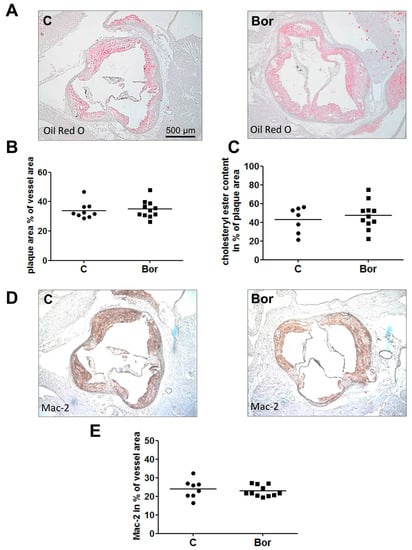 En face Oil Red O staining revealed marked atherosclerosis in both C and Bor mice, indicative of advanced atherosclerosis. Bor treatment had no effect on the en face lesion area compared to saline treatment (C: 15.74% ± 0.97%; Bor: 16.90% ± 1.39%; p = 0.502; Figure 1B). These results are consistent with lesion area quantification in the aortic root (C: 33.91% ± 1.86%; Bor: 34.86% ± 1.79%; p = 0.719; Figure 2A,B). Likewise, quantification of the Oil Red O positive plaque area yielded in similar results for both groups (C: 42.73% ± 5.24%; Bor: 47.33% ± 4.44%; p = 0.519; Figure 2C), indicating that lipid accumulation in atherosclerotic lesions of the aortic root is not influenced by Bor treatment.