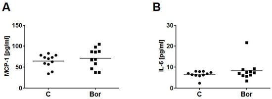 For analysis of macrophage content in aortic root lesions, Galectin-3 (Mac-2) immunohistochemistry was performed. No differences in macrophage content between either group were detected (C: 23.97% ± 1.76%; Bor: 22.81% ± 0.89%; p = 0.710; Figure 2D,E). Correspondingly, serum levels of the pro-inflammatory chemokine monocyte chemoattractant protein 1 (MCP-1) (C: 64.44 ± 4.84 pg/mL; Bor: 70.75 ± 7.19 pg/mL; p = 0.475) as well as serum levels of interleukin (IL)-6 (C: 6.57 ± 0.48 pg/mL; Bor: 8.23 ± 1.43 pg/mL; p = 0.555) did not significantly differ between Bor and C mice (Figure 3A,B).
