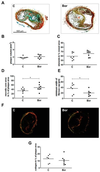 To gain further insight into plaque composition, we performed Movat pentachrome staining and Sirius Red-staining of paraffin sections of the brachiocephalic artery (Figure 4A,F). Plaque volume (C: 1.89 ± 0.11 mm3; Bor: 2.13 ± 0.19 mm3; p = 0.456; Figure 4B) and the degree of stenosis (C: 59.36% ± 2.85%; Bor: 65.41% ± 2.36%; p = 0.125; Figure 4C) were similar in Bor and C mice. However, lesions of Bor animals had a significantly larger necrotic core area compared to lesions of C animals (C: 33.19% ± 4.83%; Bor: 47.81% ± 5.24%; p = 0.029; Figure 4D). Analysis of fibrous cap width showed a significant decrease in Bor compared to C mice (C: 36.25 ± 6.74 μm; Bor: 19.86 ± 4.13 μm; p = 0.049; Figure 4E). Picrosirius red birefringence indicates a lower collagen content in the brachiocephalic artery (BCA) lesions of Bor mice (C: 13.00% ± 2.37%; Bor: 10.56 ± 2.42%; p = 0.183; Figure 4G), albeit not reaching a level of significance.