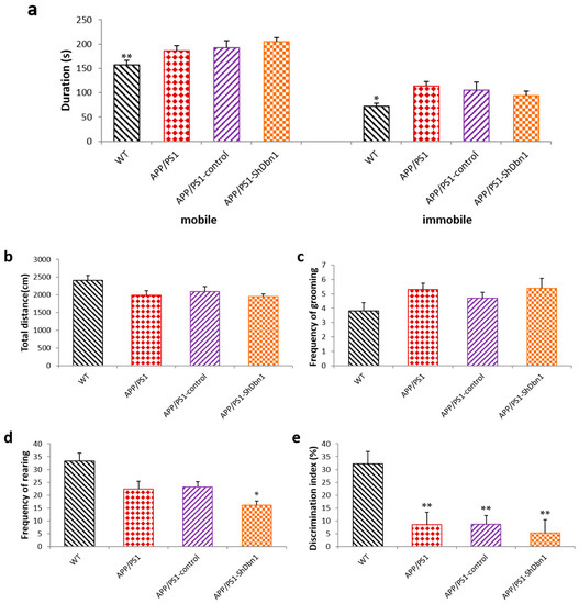 An open field test was conducted after the MWM test to explore the spontaneous motor activities and anxious mood in mice. The result shows that the duration of mobile (p < 0.01) and immobile (p < 0.05) activity of APP/PS1-ShDbn1 mice was significantly increased compared with the WT mice (Figure 3a). This implies that the APP/PS1-ShDbn1 mice appeared to be markedly anxious compared with the WT mice. There were no significant differences in total distance and frequency of grooming (p > 0.05, Figure 3b,c), but the frequency of rearing in APP/PS1-ShDbn1 mice was markedly less than that of the APP/PS1-control mice (p < 0.05, Figure 3d). These results imply that the spontaneous motor activities of the APP/PS1-ShDbn1 mice were reduced and anxious mood increased after injection.