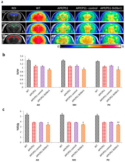 Results of MicroPET/CT. (a) Regions of interest (ROI) and PET/CT images in all groups mice (n = 5 per group); (b) relative standardized uptake value (SUVr) and % injected dose per gram of 18F-FDG (%ID/g) in ROI (* p < 0.05, ** p < 0.01 vs. APP/PS1-control).