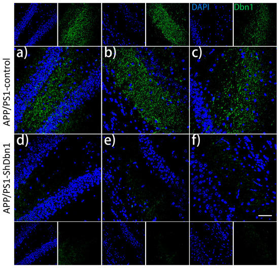 Immunofluorescence staining of Dbn in the rAAV-ShRNA injection group and without ShRNA APP/PS1 mice. (a–c) and (d–f) show different regions (DG, CA2, and CA3) of the hippocampus (n = 7 per group, Scale bar = 50 µm).